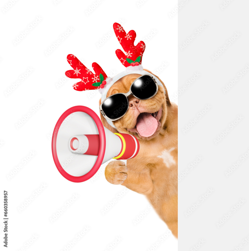 Happy Mastiff puppy dressed like santa claus reindeer Rudolf looks from behind empty white banner and barks into megaphone. isolated on white background