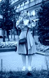 A female tourist takes pictures of the city on her smartphone