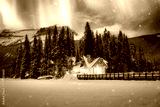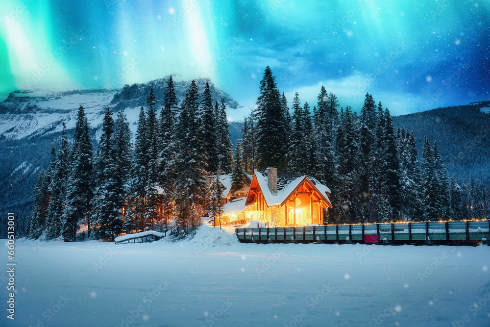 View of Northern lights glowing over Emerald Lake Lodge with snowy forest on winter at Yoho national park, Canada