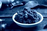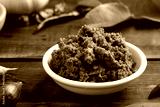 Thai green curry paste in white bowl, made from a mixture of herbs and spices on wood table (prik gaeng keow waan)