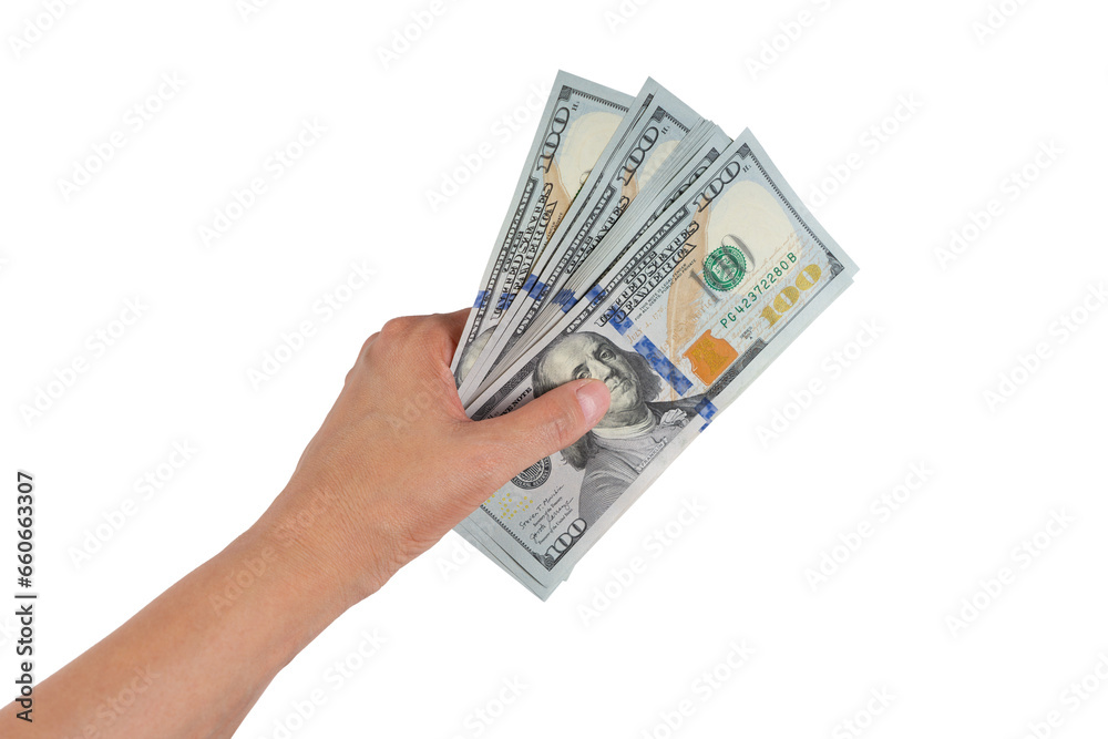 Woman hand with dollar cash isolated on white, transparent background, PNG. Allocation of money, economy concept, US dollar falling or rising. Top view, flat lay. Business, finance, bank, currency.