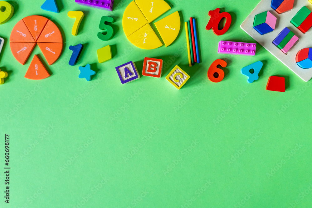 Colorful math fractions, numbers, letters on green background. Interesting, fun math for kids. Education, back to school concept