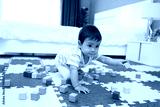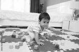 happy infant baby playing wooden block toy on jigsaw mat in bedroom