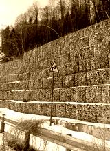 Gabions, mesh structures made of stones that strengthen the slopes, from the sliding of the ground . on a mountain winter road.