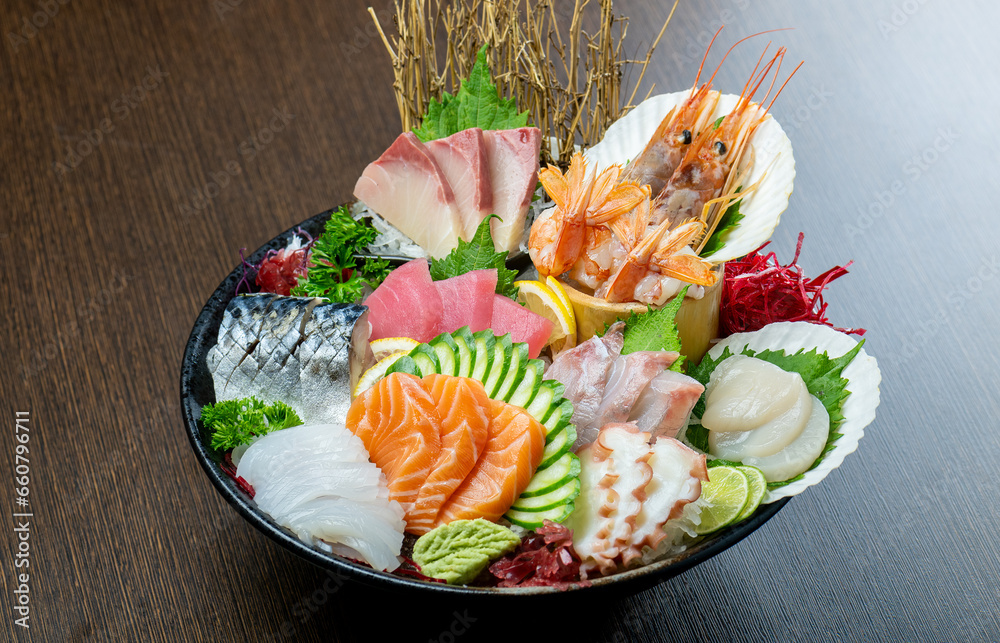 sashimi mixed fresh set japanese food variation in dish. Sashimi Japanese food, Sashimi set with wasabi, fish, shrimp in plate of Assorted. fresh slide mix fish set on ice menu in restaurant
