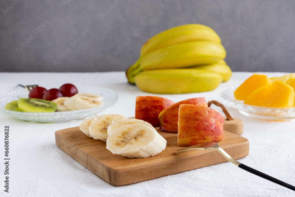お皿やカッティングボードに盛られたくだものパーティー