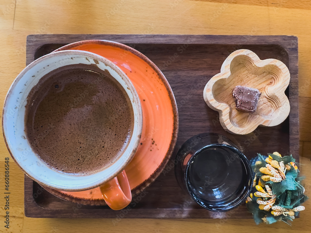 A cup of traditional Turkish coffee on a tray. Selective focus.