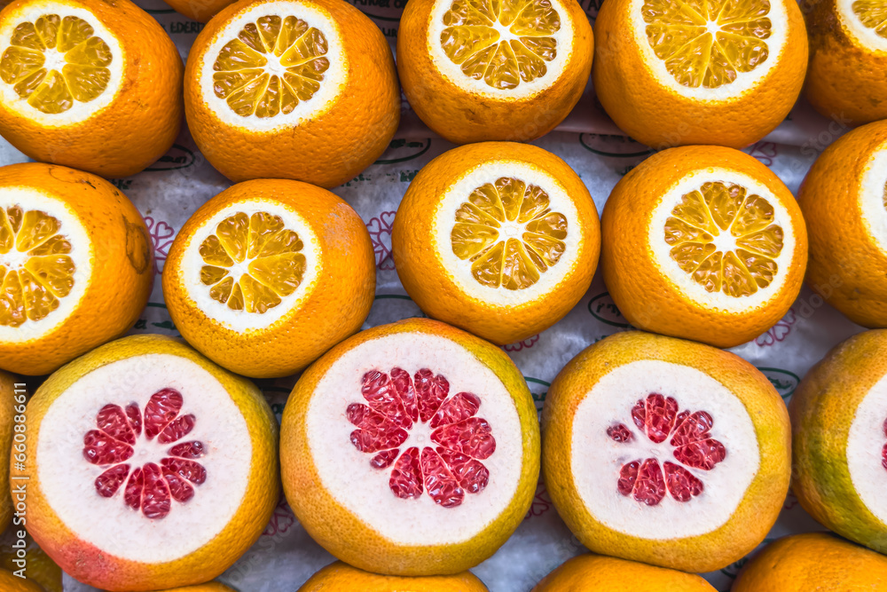 Ripe fresh oranges and grapefruits ready for squeezing juice.Selective focus.