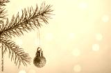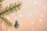 Silver Christmas ball on a fir branch against a background of sparkling lights. Blurred background, selective focus. Christmas background, postcard.
