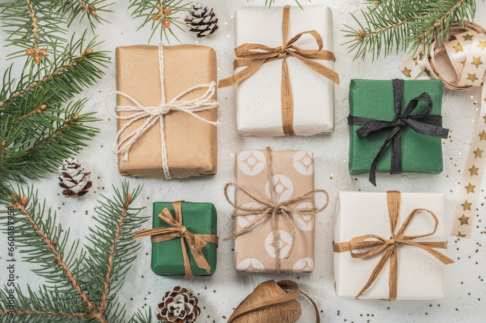 Christmas gift boxes made of kraft paper on a white background with fir branches,packing tapes and pine cones. Christmas background pattern. Boxing Day.