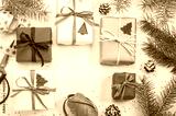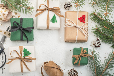 Christmas gift boxes made of kraft paper on a white background with fir branches. Christmas background pattern, packaging made from environmentally friendly materials. Boxing Day.
