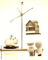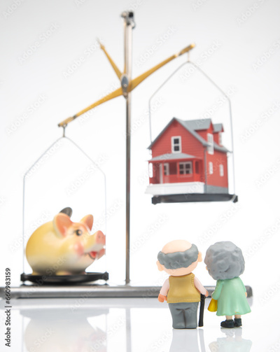Pensioners stand near a piggy bank with a house on the scales. The concept of accumulating finances to buy a house for living. home real estate financial investment