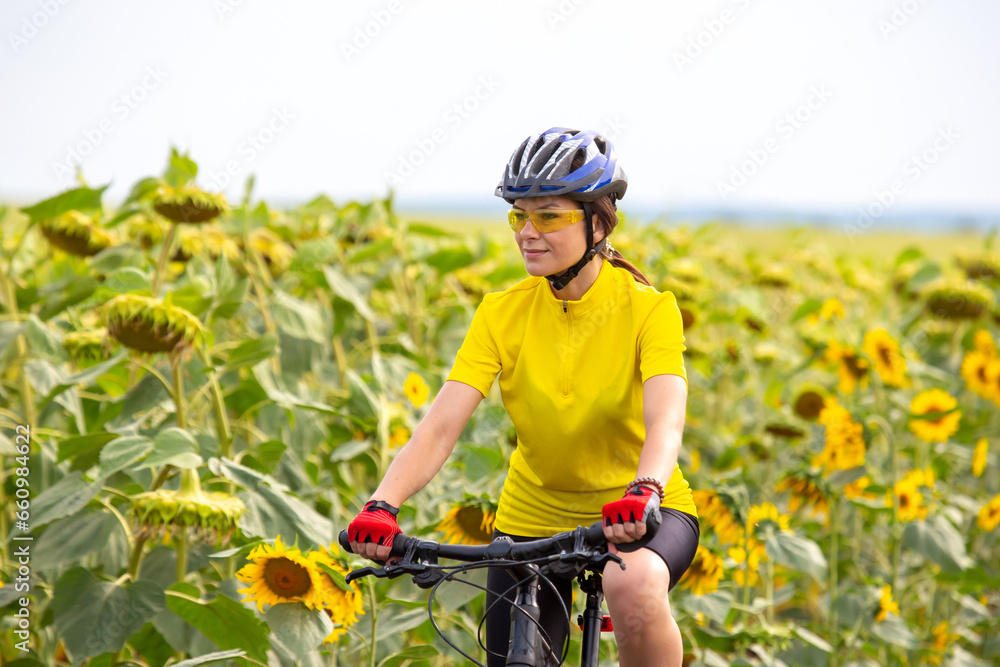beautiful woman cyclist in a yellow shirt rides a bicycle along a field road. sports, hobbies and entertainment for health