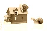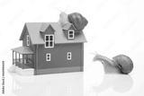 Snail on the roof of a house model on a white background. The concept of home comfort and life in the house