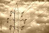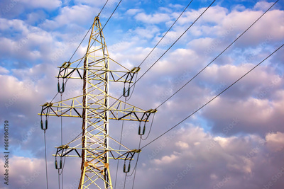 Energy industry. High voltage tower with power wires against the background of clouds.