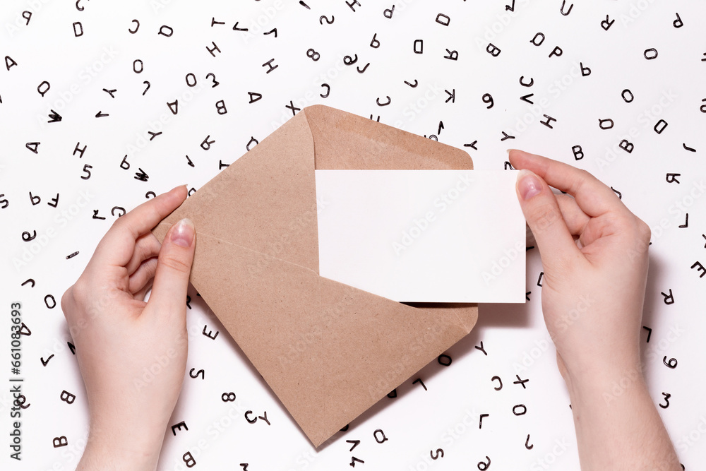 First person top view photo of female hands holding open craft envelope with white card, Receive mail