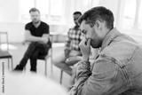 Closeup rear view of thoughtful young bearded man crying and talking about mental state sitting in circle during group therapy session. Concept of mental health, psychotherapy, social issues.