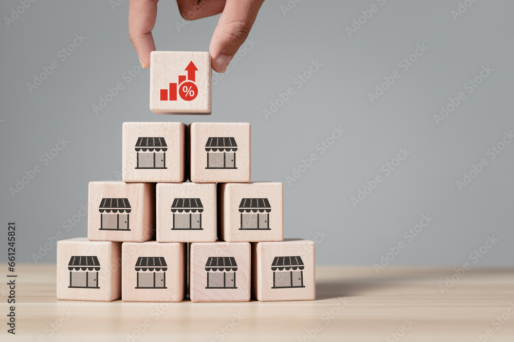Franchise business icons on wooden blocks for franchise marketing growth concept, franchise marketing system in global business network and brand building.