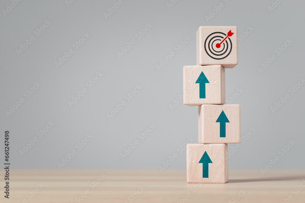 Successful business growth concept. wooden block with target icon and arrow aim to target. business development, business plans and strategies, investment and growth.