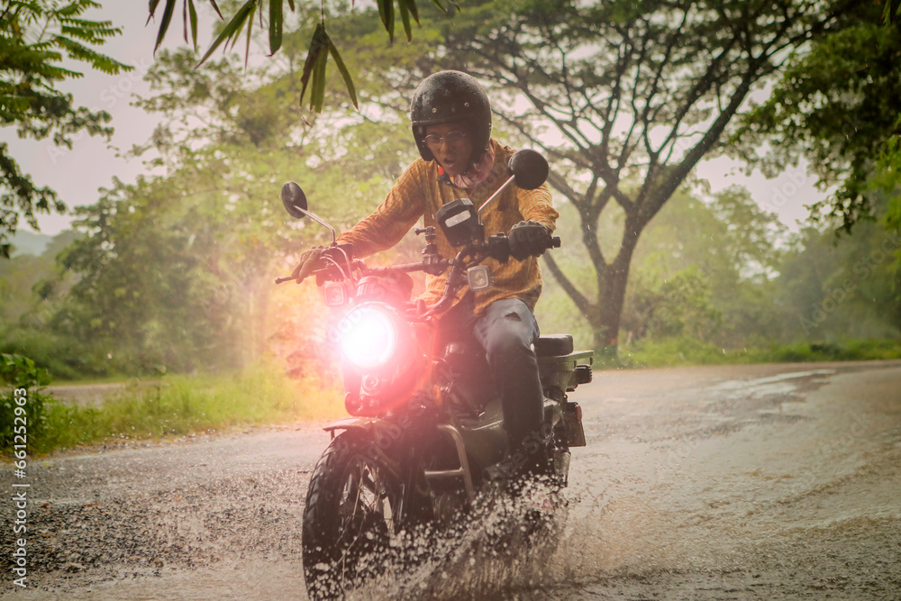 man riding small endurom motorcycle crossing shallow creek among rain falling at forest