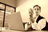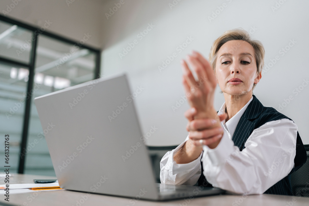Closeup low-angle view of exhausted middle-aged business woman feeling severe wrist arm pain while overwork typing on laptop computer at workplace. Mature female manager tired massaging hand.