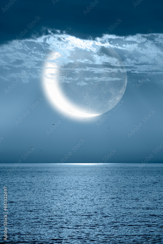 Ramadan concept - Crescent moon over the tropical sea at night "Elements of this image furnished by NASA"