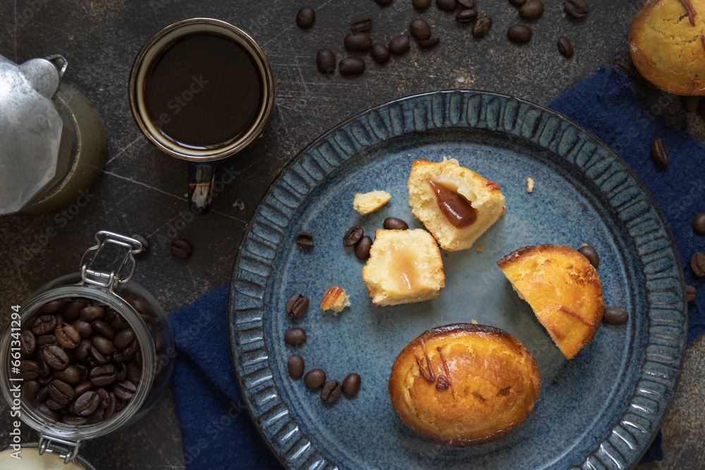 Pasticciotto leccese pastries on a plate near coffe cup and moka on dark table top view