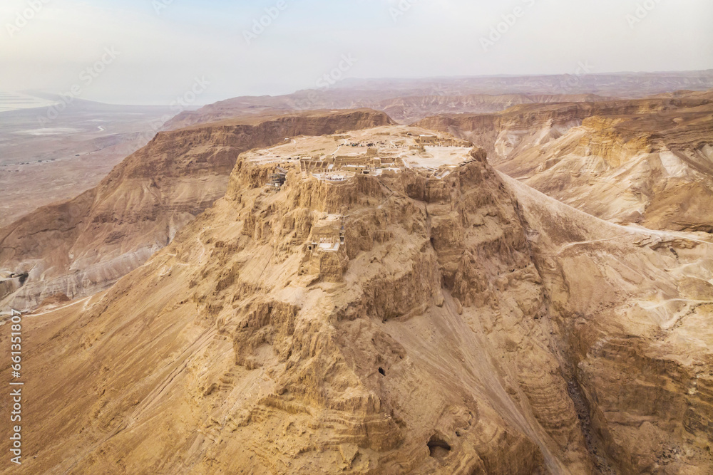 Scenic view of the cliff with a flat platform on the top shot from the air. Ancient isolated settlement on plateau in Judean desert, Israel. Archaeological works. Ruins of ancient fortification