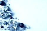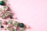 Overhead view Christmas decorations, gift boxes, fir tree branches, confetti on pastel pink background. Christmas Greeting card design with stylish Xmas ornaments.
