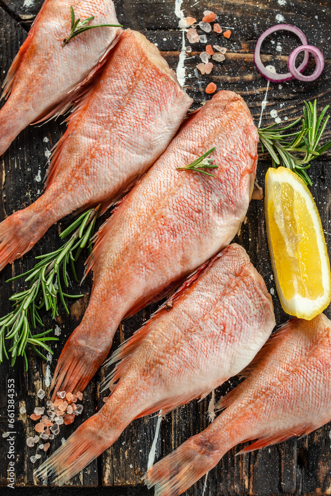 Raw fish perch with lemon, rosemary, salt on a dark background. banner, menu, recipe place for text, top view