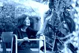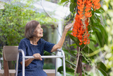 Smiling elderly woman in garden. Happy senior woman sitting on terrace with red jade vine flowers at home.