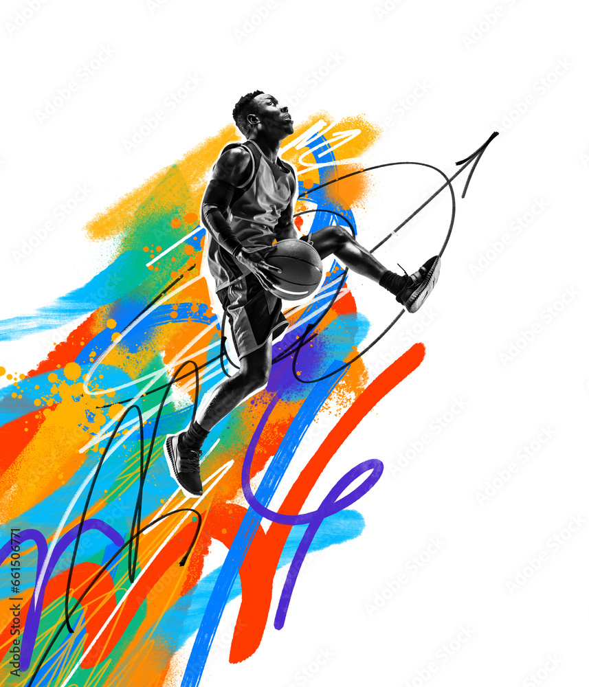 Young african man, basketball player in motion during game, jumping with ball over colorful background. Creative art collage. Concept of professional sport, competition and match, dynamics. Poster, ad