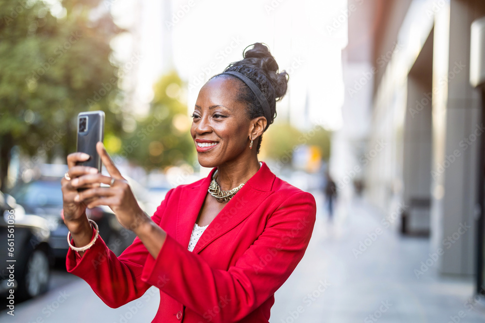 Portrait of smiling mature businesswoman using mobile phone in urban setting