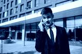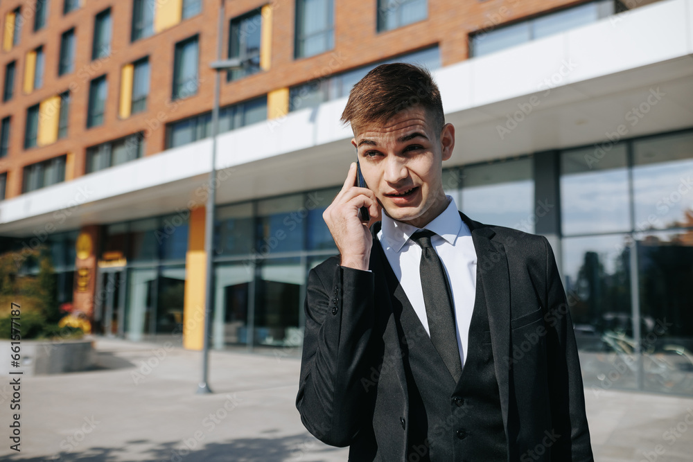 A young Caucasian American man, dressed in a sharp business suit, expresses his anger while engaged in a heated phone conversation on the bustling streets of the urban district.