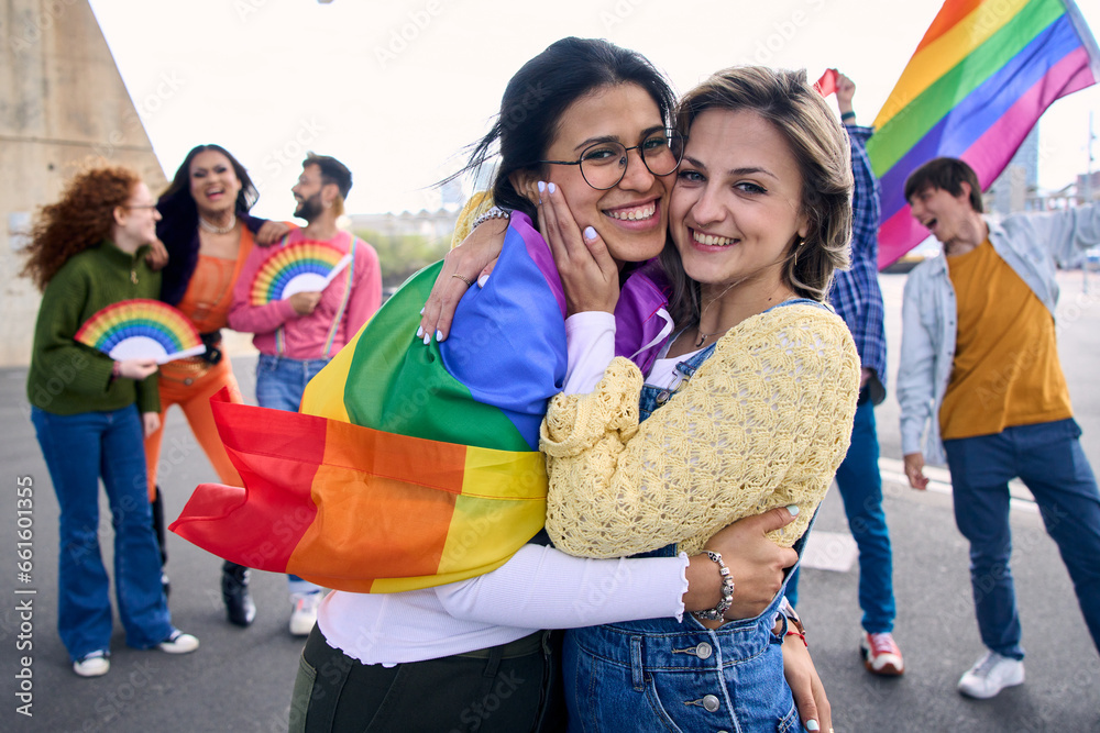 Portrait of couple lesbian girls hugging affectionate on gay pride festival day in city. Two young multiracial women pose loving and smiling celebrating LGBT party with excited friends in background.