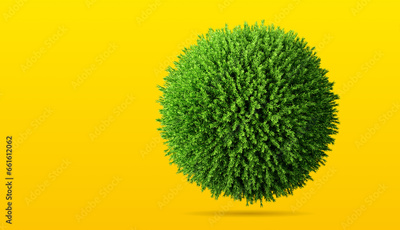 Round coniferous plant, green sphere or bush isolated on yellow background. Top view. Template or layout. 3d render