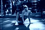 Young, beautiful girl listening to music on headphones after a sports practice at the sports ground at sunset