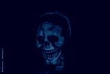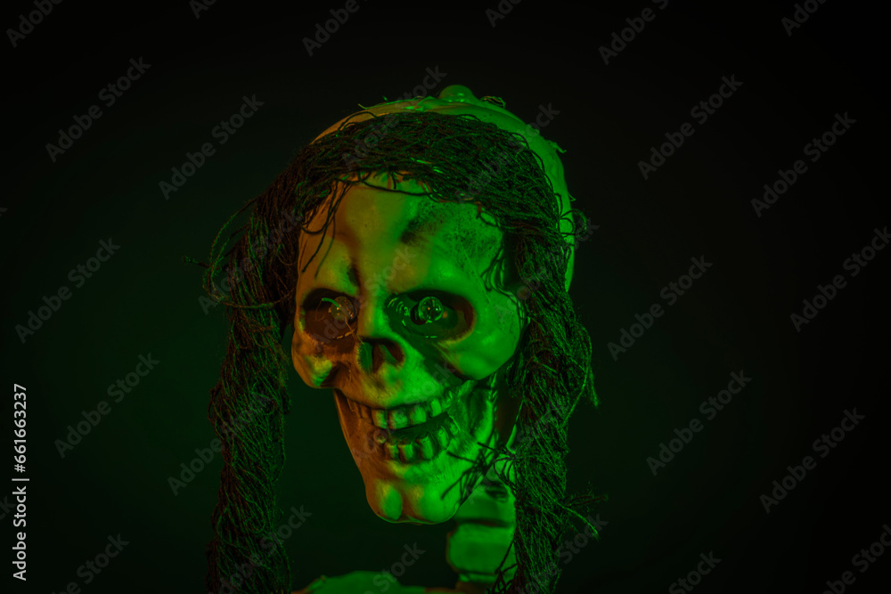 Close up view of green lighted skeleton head on black background. Halloween concept.