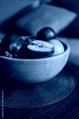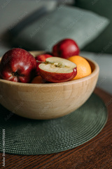 Fresh apples and oranges in a wooden plate. Some of the apples are cut into halves. Apples are ripe and red