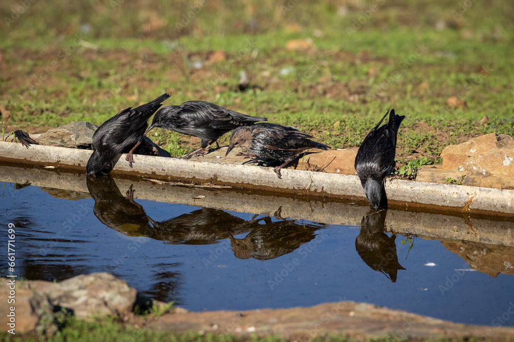Spotless starling (Sturnus unicolor). Birds drinking in a pond.