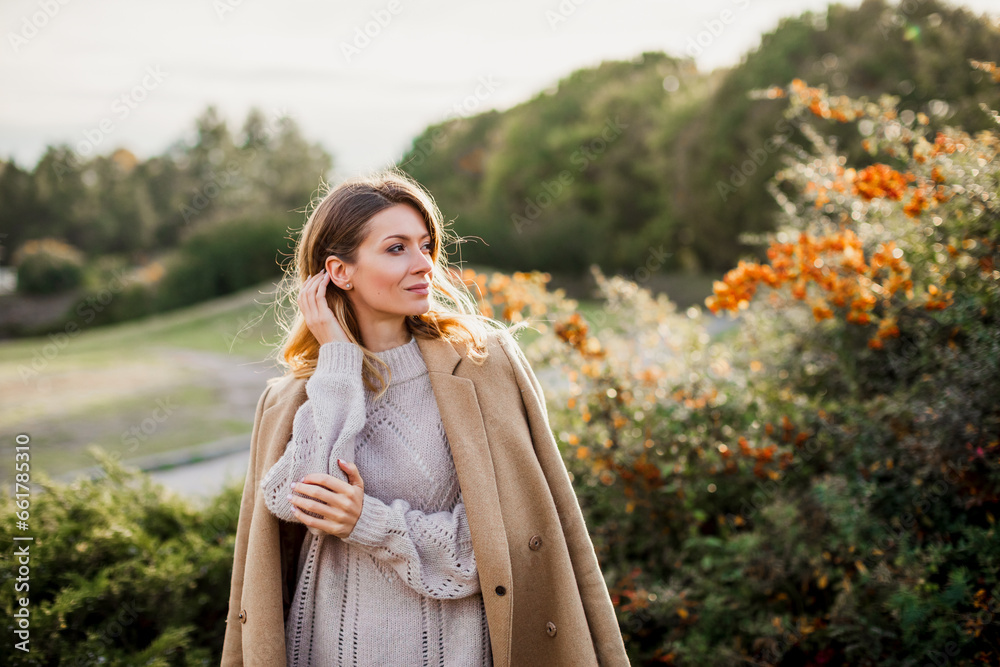 Beautiful portrait of a Caucasian girl in an autumn coat walks on a warm sunny day in the autumn park. Happy young woman enjoying golden autumn. autumn leaves