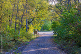 Beautiful autumn landscape with barrier gate blocking forest road, surrounded on both sides by green and yellow trees. Sweden.