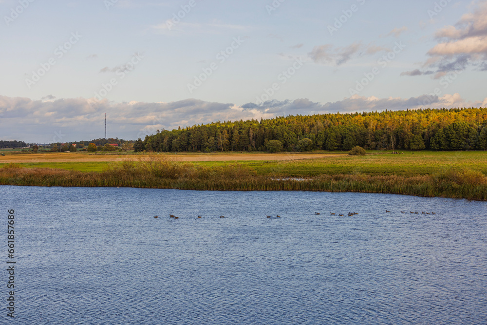 Autumn view of lake with swimming ducks on backdrop of agricultural fields. Sweden.