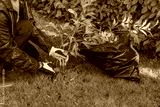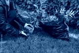 View of man pruning peony bush in garden on autumn day. Sweden.