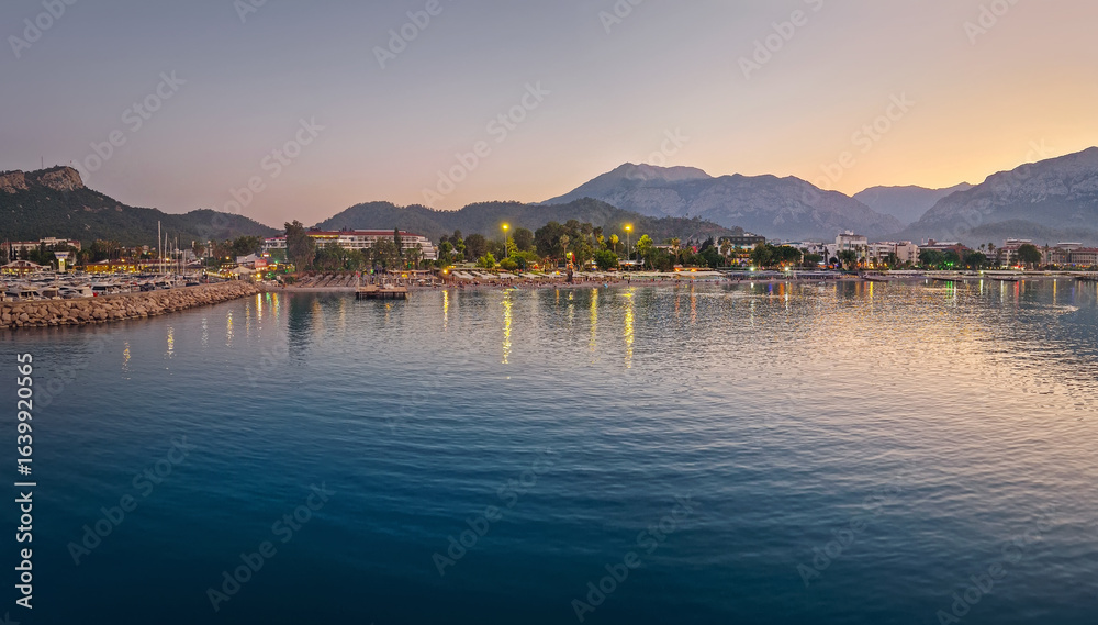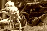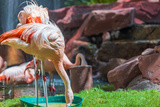Close-up view of pink flamingo in park near pond drinks water from bowl. USA.