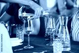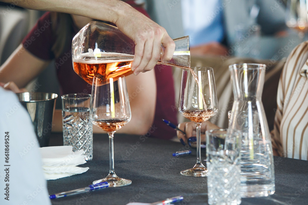 Sommelier pouring wine into decanter to the glasses during alcoholic beverages training for staff, close up.