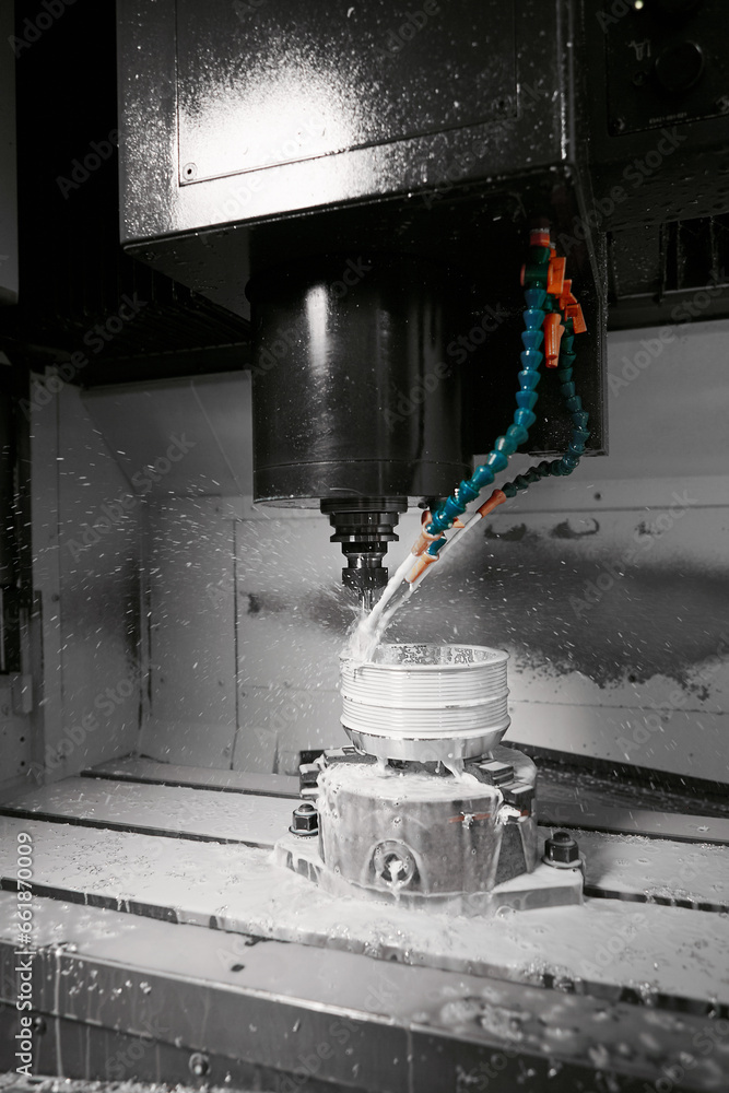 Auto CNC turning with robot drill milling factory with water coolant streams. The mold and die manufacturing process by CNC machining center.