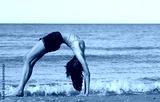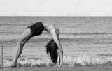 slender girl making a bow by arching her back backwards on the seashore