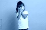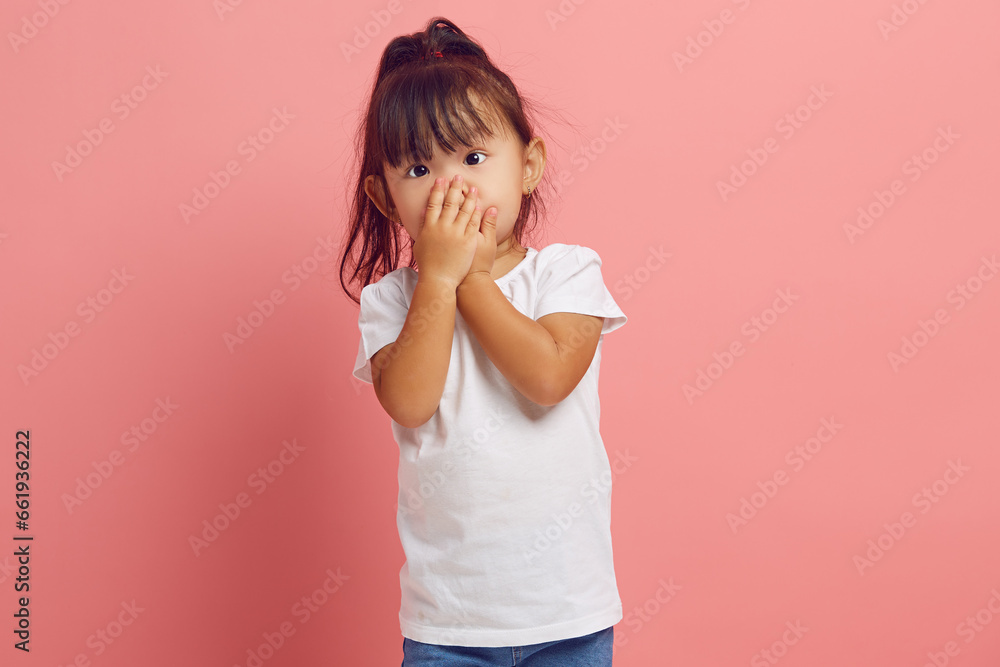 Shocked little girl covers mouth with hands stares scared at camera cannot believe in something horrible dressed in white t shirt isolated over pink background.