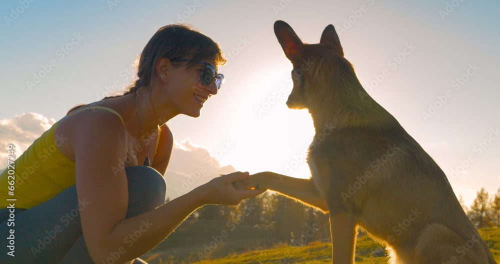 CLOSE UP, LENS FLARE: Smiling young woman teaches her cute dog how to give a paw